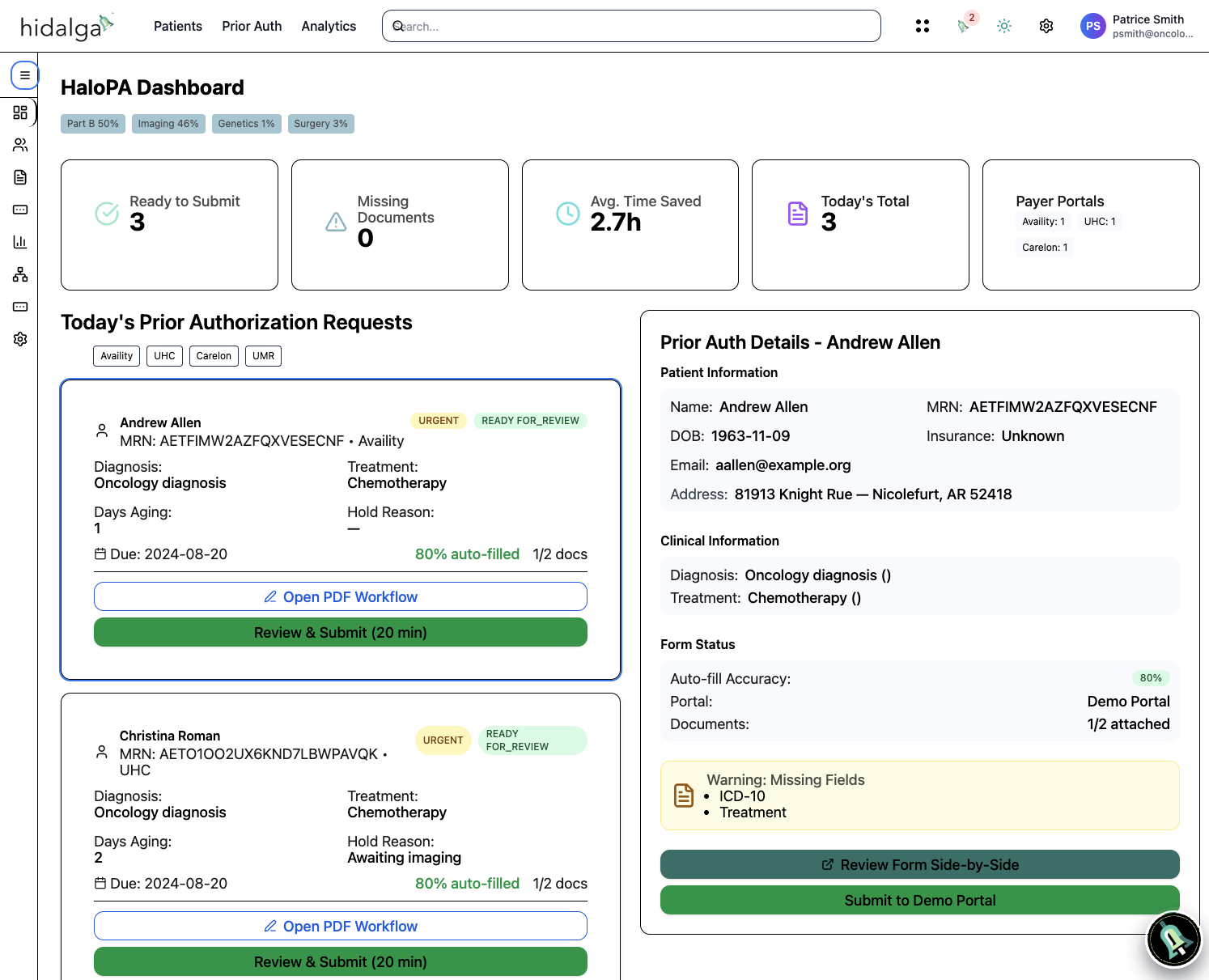 hidalga™ brings real-time prompts, navigator workflows, and clear status insight into the chart, so teams spend less time in portals and more time moving patients to treatment.